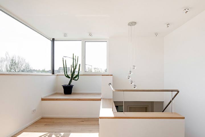 Ein radikaler Umbau, der den Look des Hauses aus den 70ern bewusst eliminiert. Eine Aufstockung für den Haus-Charakter. Eine Galerie über dem Essplatz. Ein Obergeschoss mit mehr Luftraum für die unteren Räume. Eine Lüftungsanlage mit Wärmerückgewinnung. Und deutlich mehr Licht in allen Räumen.