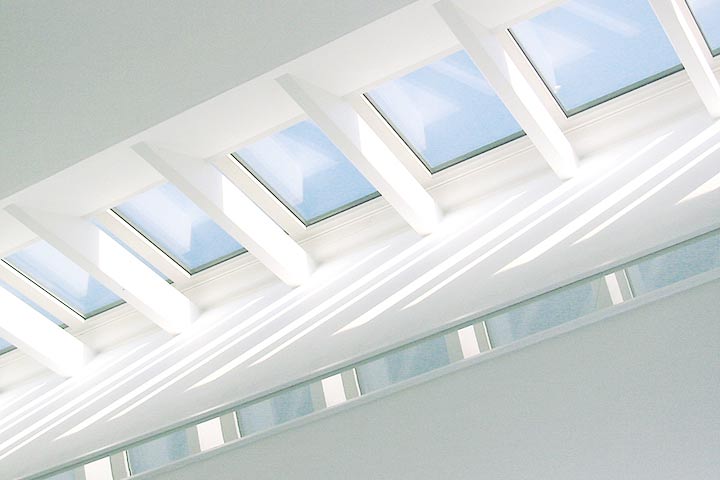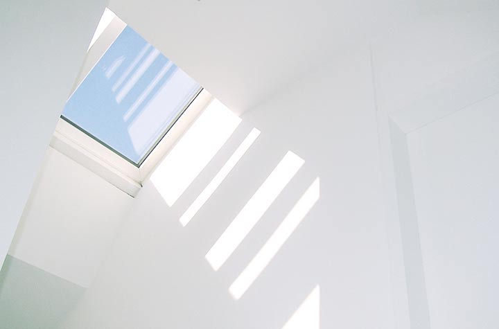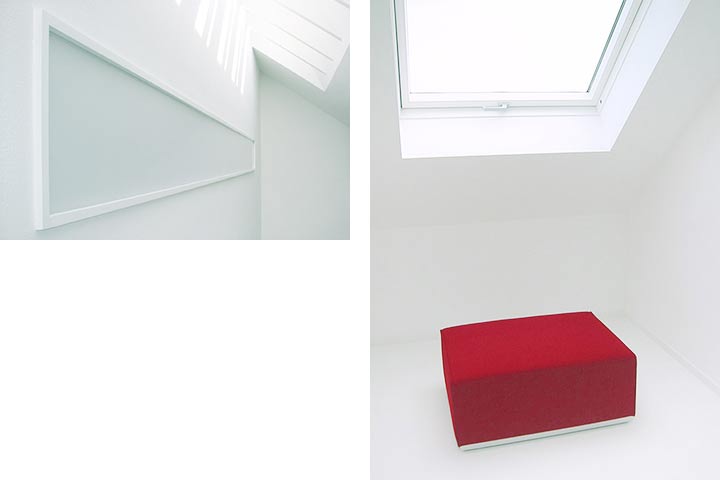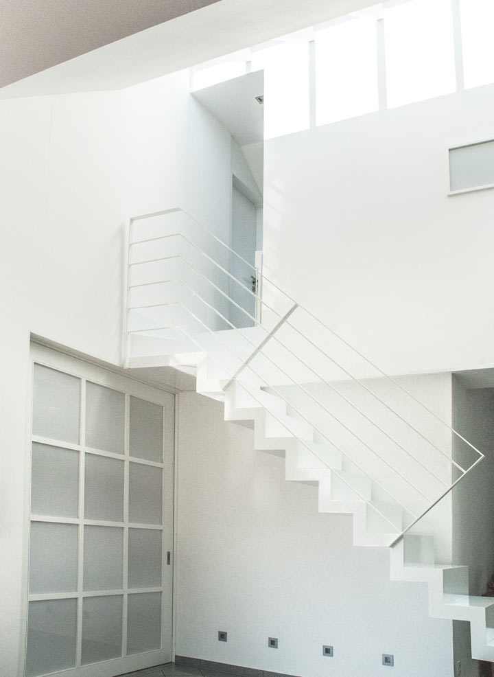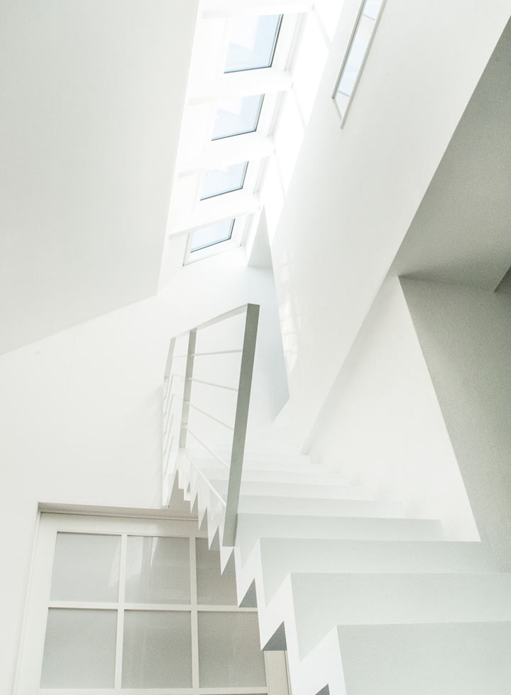 Gemeinsam mit dem Architekten wurde die Notwendigkeit kurzerhand zur Skulptur erhoben. Die Treppenlösung: ein selbsttragender Stahlhohlkörper in reinem Weiß. Im Ganzen gefertigt und geliefert. Wie ein Schiffsanleger, nur an Kopf und Fuß verankert. Scheinbar berührungsfrei im weißen Raum nach oben steigend. Wo das reine Weiß im neu erschlossenen Dachgeschoss fortgeführt wird. Ohne sichtbaren Übergang von Boden zu Wand entsteht so ein vom Materiellen losgelöstes Raumgefühl, das auf wunderbare Art Momente der Ruhe schenkt. Oder, wie die Kinder sagen: „Das ist wie schweben.“