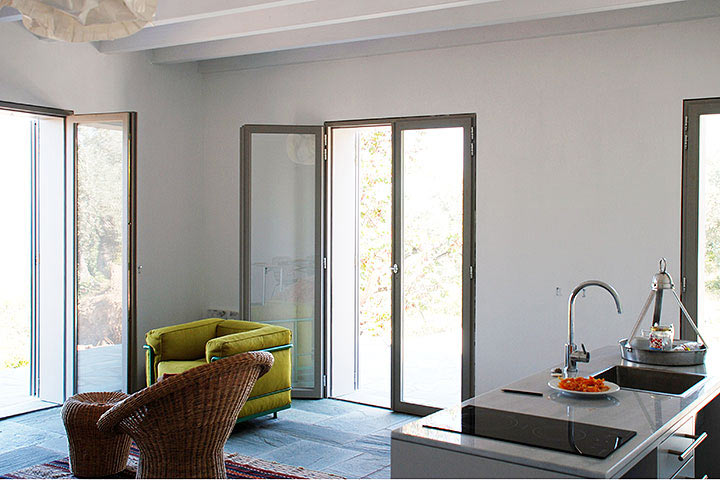 Bündig eingebaute Fenster innen und in die Fassade integrierte Schlagläden außen, die das vollständige Öffnen bis zur Wand ermöglichen.