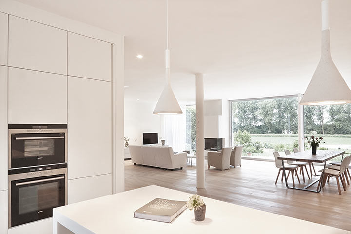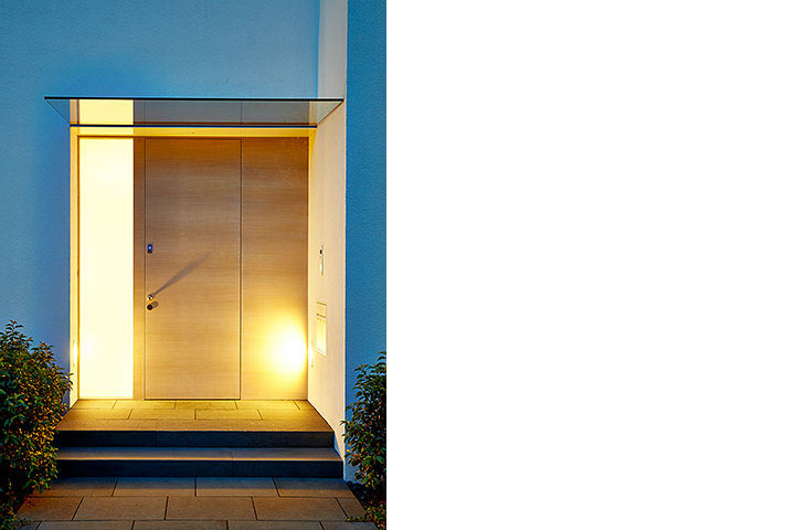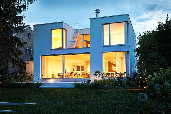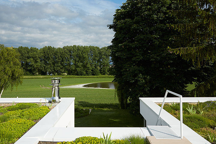 "Skulpturale Kraft entsteht im intensiven Dialog mit der Umgebung", stellt Architekt Martin Falke dazu fest. Er entwarf den weißen Gebäudekubus als selbstbewussten Gegenpol zur exponierten Rheinlage: zurückhaltend geschlossene Fassade zur Straßenseite. Offenheit und Transparenz zu Garten und Rhein. Durchbrochene Flächen für Einblicke und Belichtung. Klassische weiße Moderne auch im Inneren: eine kühn geschwungene Treppe aus präzise gebogenen Metallelementen. Ein puristisch angelegtes Badezimmer mit starker Blickbeziehung nach außen. Und ein Sonnendeck auf dem Flachdach, das dem Ausblick mehr als gerecht wird.