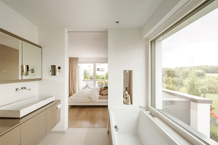 Über eine einläufige Treppe gelangt man ins Obergeschoss, wo sich neben einem Kinderzimmer mit eigenem Bad der Elternteil mit Wellnessbereich erstreckt. Von der Sauna aus gelangt man über eine schmale Außentreppe direkt an den Pool. Der Pool verzahnt die Bereiche Terrasse, Haus und Garten. Die Reflektionen des Sonnenlichts vom Wasser des Pools an der Decke im EG tauchen das Erdgeschoss in ein mediterranes Ambiente.