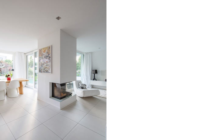 Der große Kaminofen ist verbindendes Element der einzelnen Bereiche im EG.