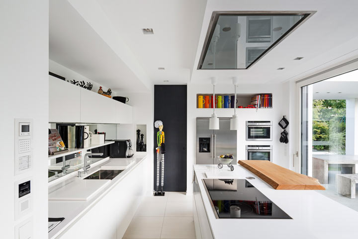 Baukörper integriert. Um die Fläche für das Haupthaus möglichst großzügig zu gestalten, wurde die Einliegerwohnung über eine Maisonette in die untere Ebene erweitert. Hier wurde mit Hilfe von Heliostaten durch einen Schacht Sonnenlicht in die untere Ebene gebracht, die nun in natürliches Licht getaucht ist.