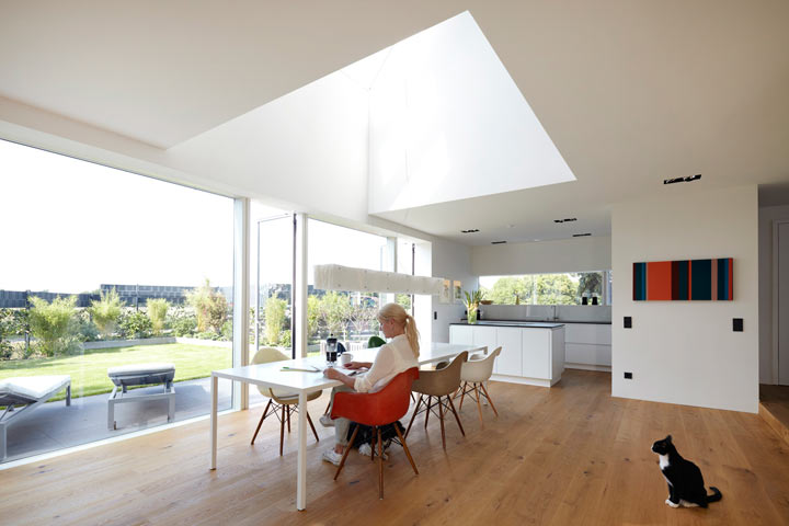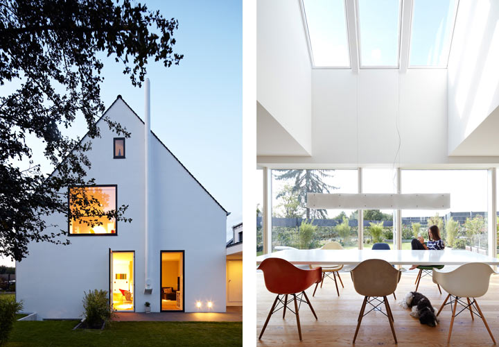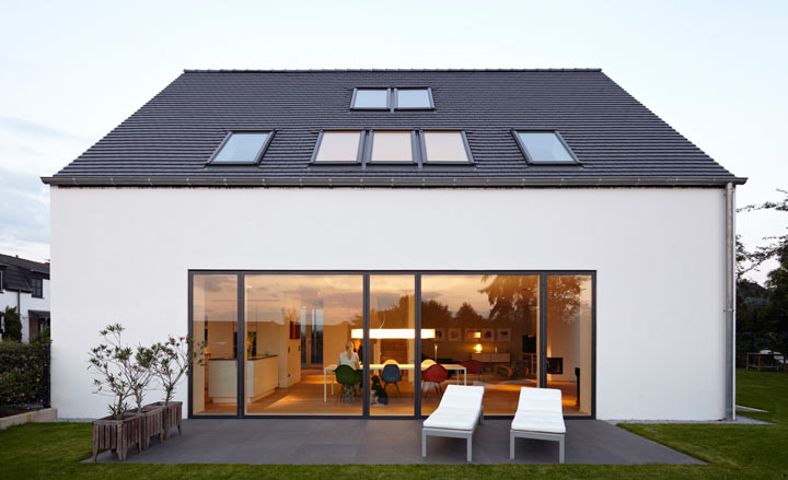 Über dem Esstisch öffnet sich die Decke in das Dachgeschoss zu einem zweigeschossigen Luftraum, der sich durch drei große Dachflächenfenster in den Himmel erweitert. Im Dachgeschoss sind zwei Kinderzimmer mit Bad und separatem Ankleidezimmer angeordnet. Eine schmale Treppe führt in den Spitzboden zum Elternschlafzimmer, von wo man aus dem Bett einen herrlichen Blick bis zu den Siegauen hat. Ein kleines Haus mit viel Raum.