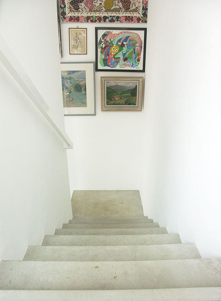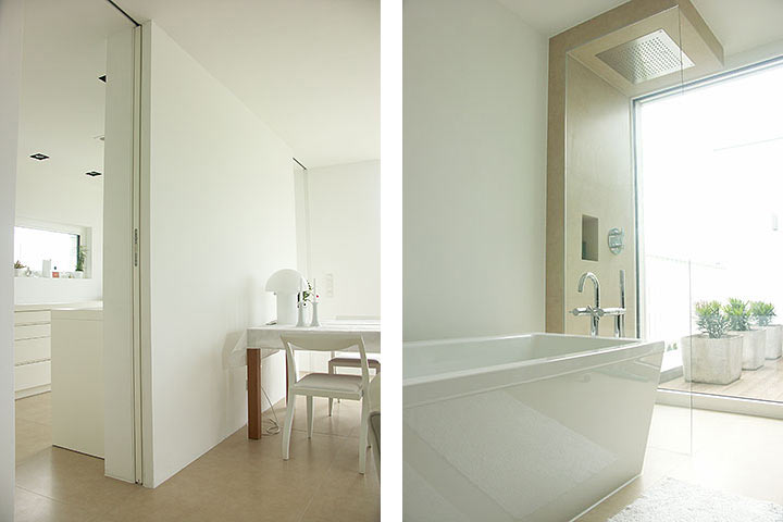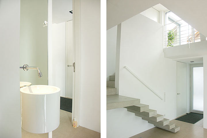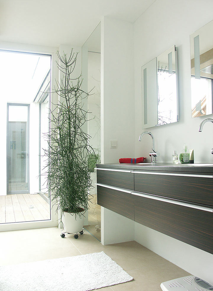 Die Eckdaten des Entwurfs von Martin Falke: 162 m2 Wohnfläche, inklusive Einliegerwohnung, ohne Keller. Eine offene Grundrissgestaltung. Vollständiger Verzicht auf Diele, Flur und Erschließungsflächen. Raumhohe Innentüren für noch bessere Belichtung und mehr Weite. Ein Treppenaufgang, dessen frei auskragende Stufen selbstbewusst als Gestaltungselement im Wohnraum dienen. Eine kleine Galerie im Obergeschoss, mit Blickbeziehung in den Wohnraum. Und ein Badezimmer, dessen Komplettverglasung zur Loggia hin das sommerliche Lebensgefühl an 365 Tagen im Jahr entstehen lässt.