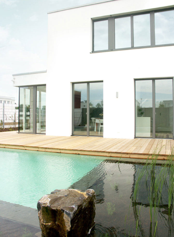 In einem Neubau-Gebiet in Widdersdorf hatte der Bauherr einen Bauplatz erworben und schon konkrete Vorstellungen von seinem Traumhaus entwickelt: Ein Haus, das ihn jeden Tag in Urlaubsstimmung versetzt, wollte er, viel Platz und offenen Raum, und zusätzlich eine eigenständige Wohneinheit. Auch beim Garten gab es einen großen Wunsch: Ein Schwimmteich sollte her, natürlich mit entsprechender Südterrasse dazu. Eine Herausforderung also für ein kleines Grundstück – und die Ausgangslage für Martin Falke.
